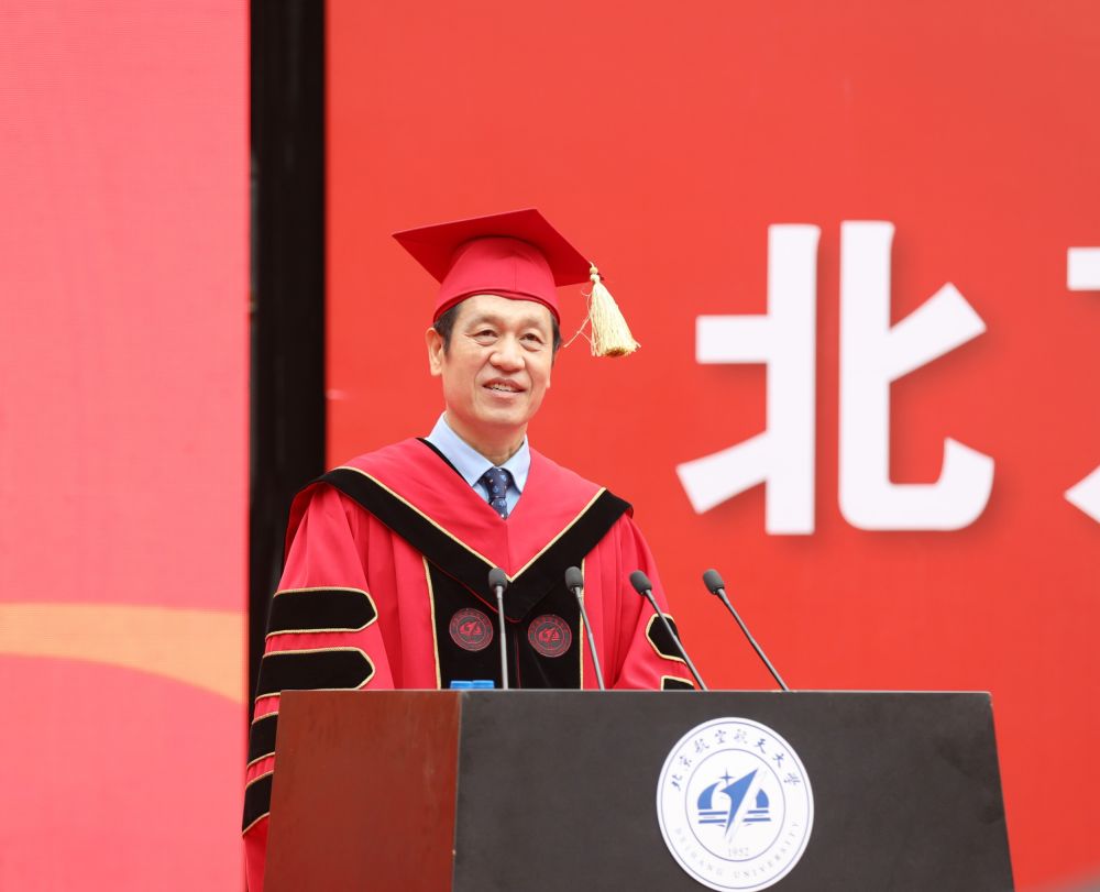 面对“云端”毕业生们,北京航空航天大学校长、中国工程院院士徐惠彬,深情讲述了今年以来我国抗击疫情的巨大努力,以及我国在航空航天领域取得的重大突破,并以长征五号在研制过程中经历的艰难历程为例,激励学子们永葆报国之志、自觉肩负责任。