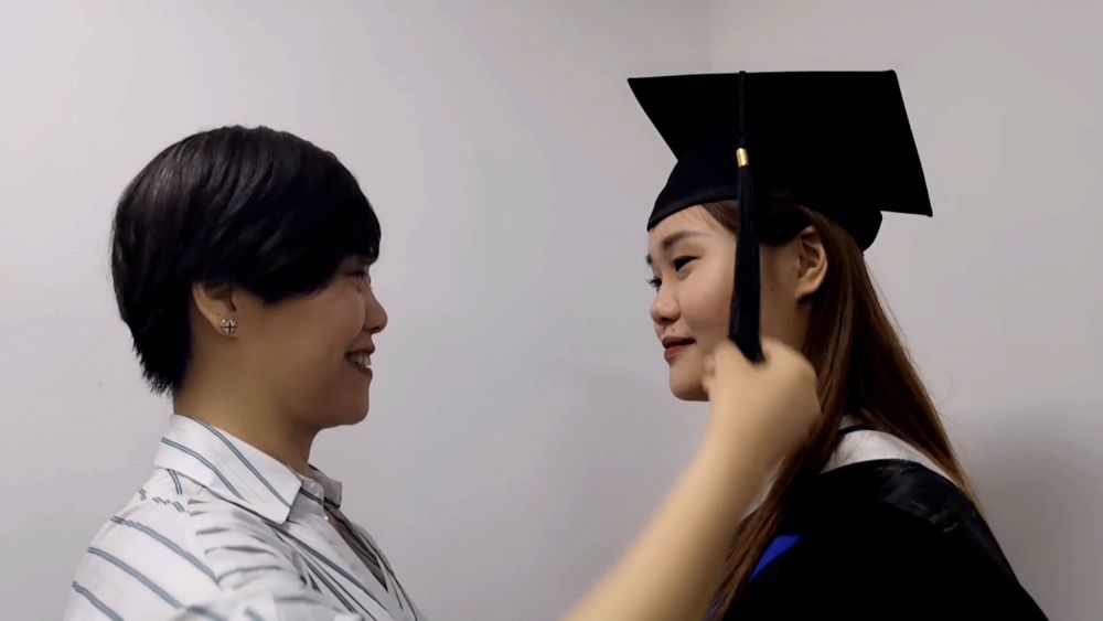 北航空间与环境学院毕业生张严文在长沙的家中由妈妈帮忙拨穗。