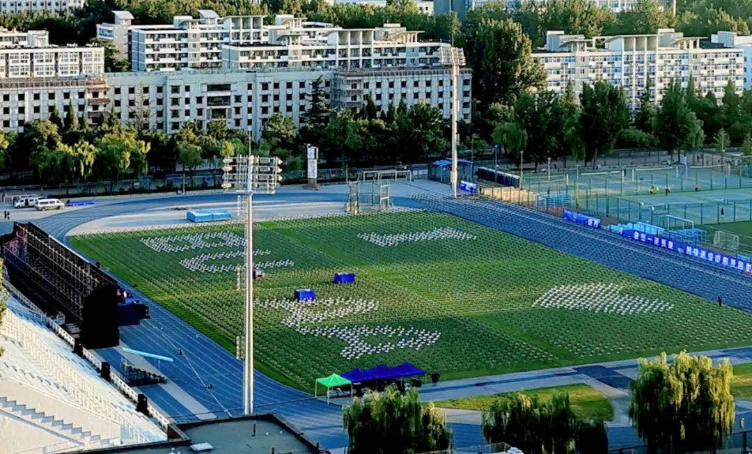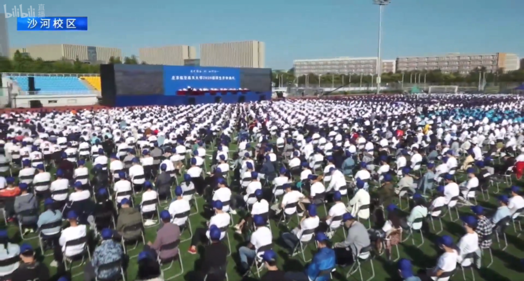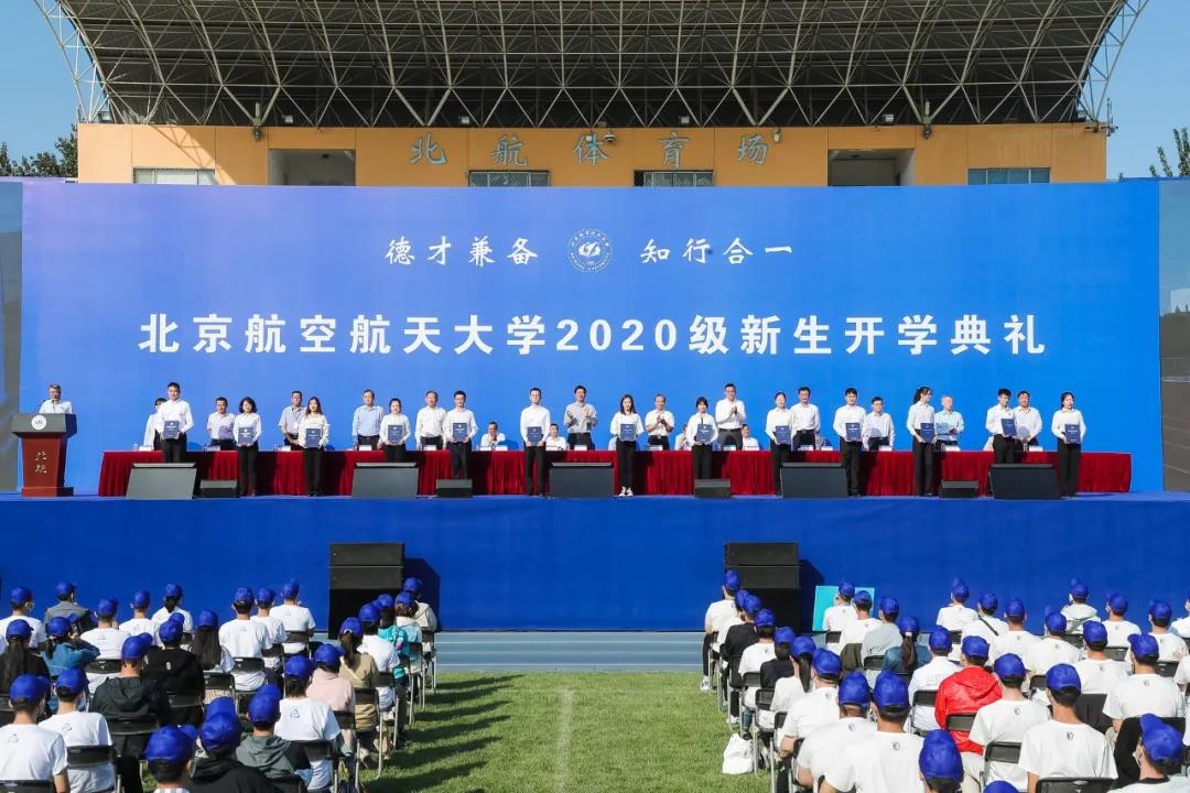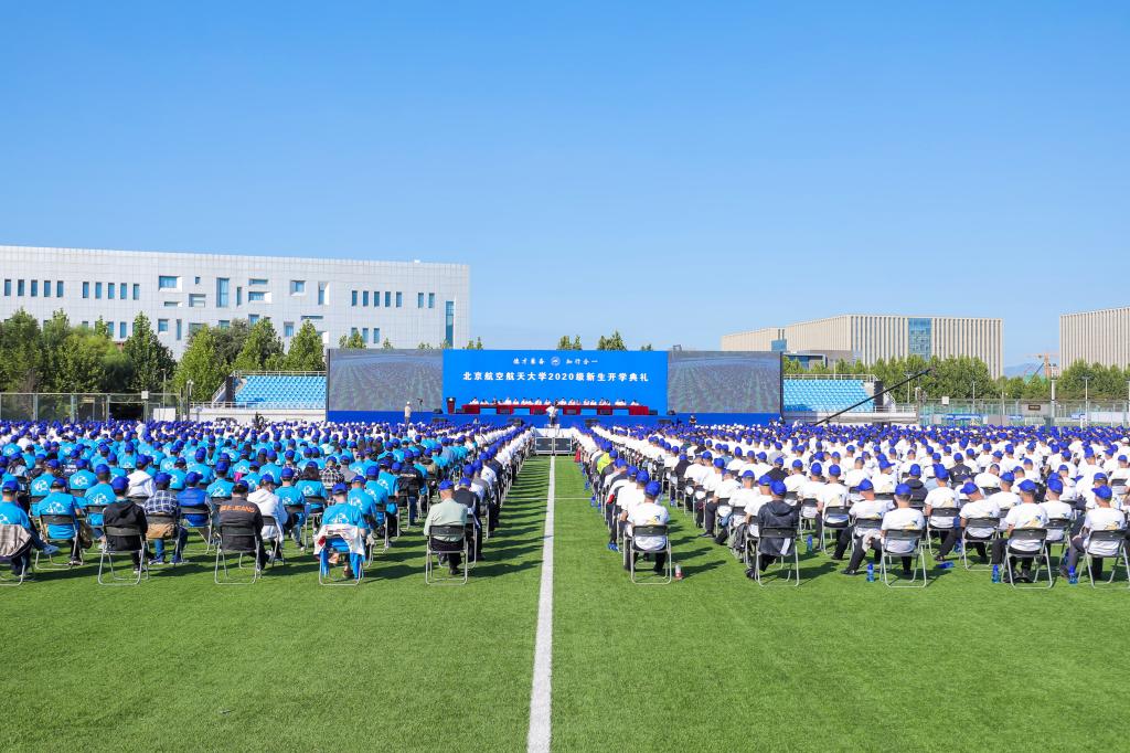 两校区宽阔的体育场上,蓝白两色交叉组成“I?BUAA”的巨幅醒目图案,表达新生对学校的真挚情感;主席台正上方悬挂着“北京航空航天大学2020级新生开学典礼”长条横幅,左右两边矗立着两块巨型屏幕,用以播放学校为新生精心制作的视频和两校区典礼直播盛况。