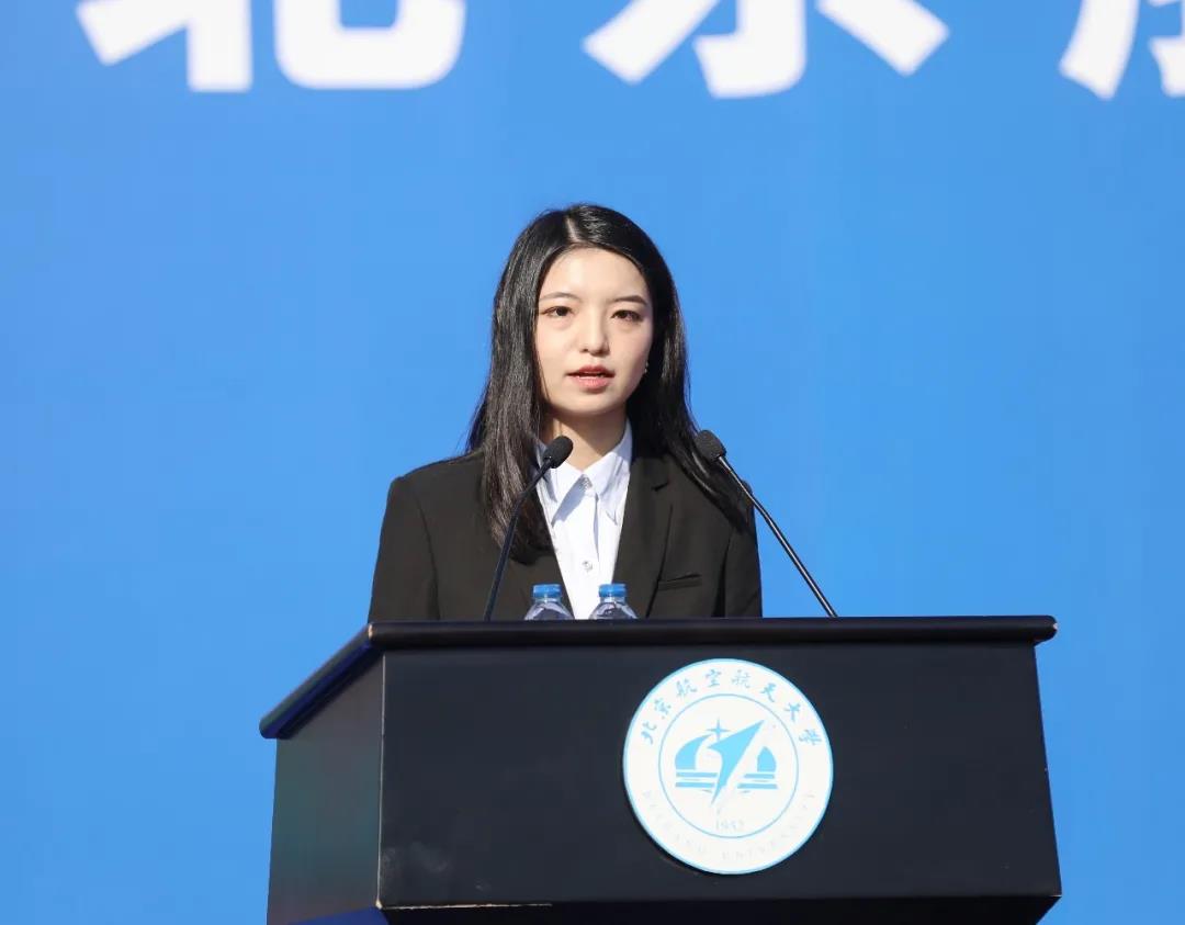 航空学院2020级硕士研究生姚卓尔代表全体研究生新生发言,他表达了勇担空天报国使命的决心,立志要报效祖国、锤炼品德修为、练就过硬本领,传承空天报国,敢为人先的精神,为实现中华民族伟大复兴贡献力量。