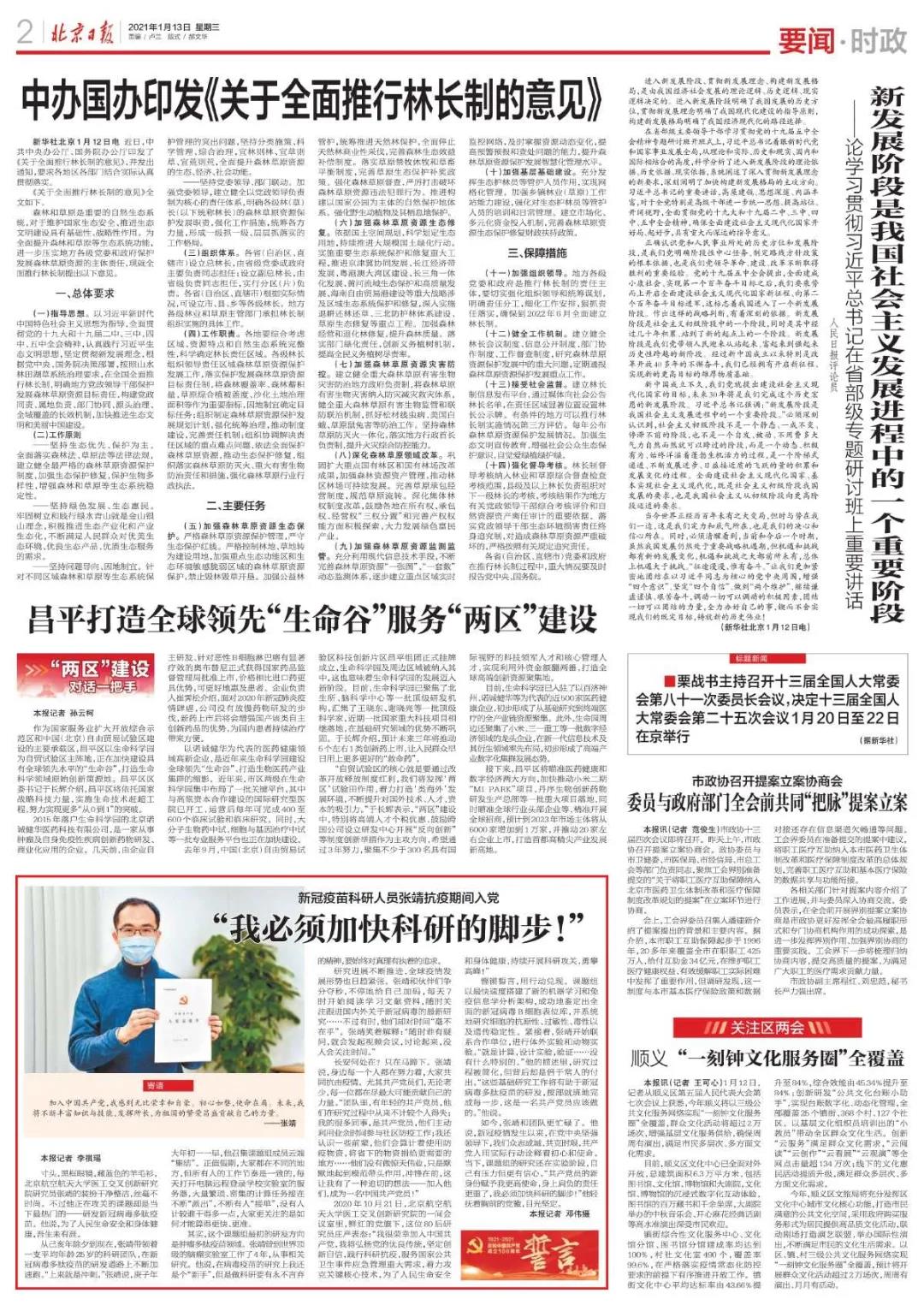 《北京日报》要闻版2021年1月13日报道我校医工交叉创新研究院生物医学工程高精尖中心研究员张靖抗疫期间入党事迹
