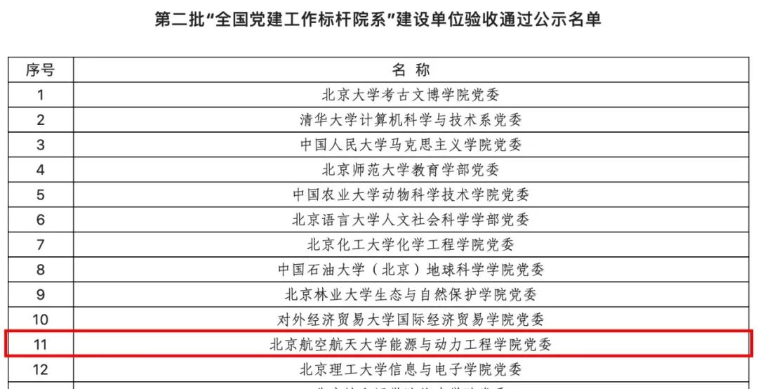 北航新闻网6月27日电(航宣)日前,教育部思政司公布第二批“全国党建工作标杆院系”建设单位验收通过公示名单,我校能源与动力工程学院党委顺利通过验收。