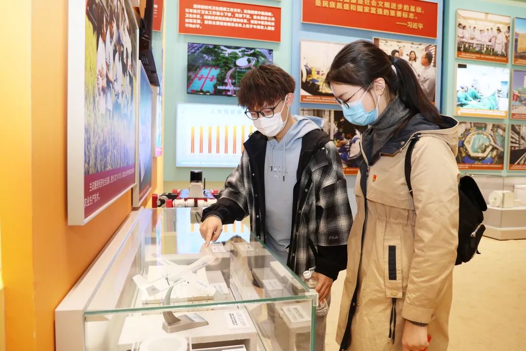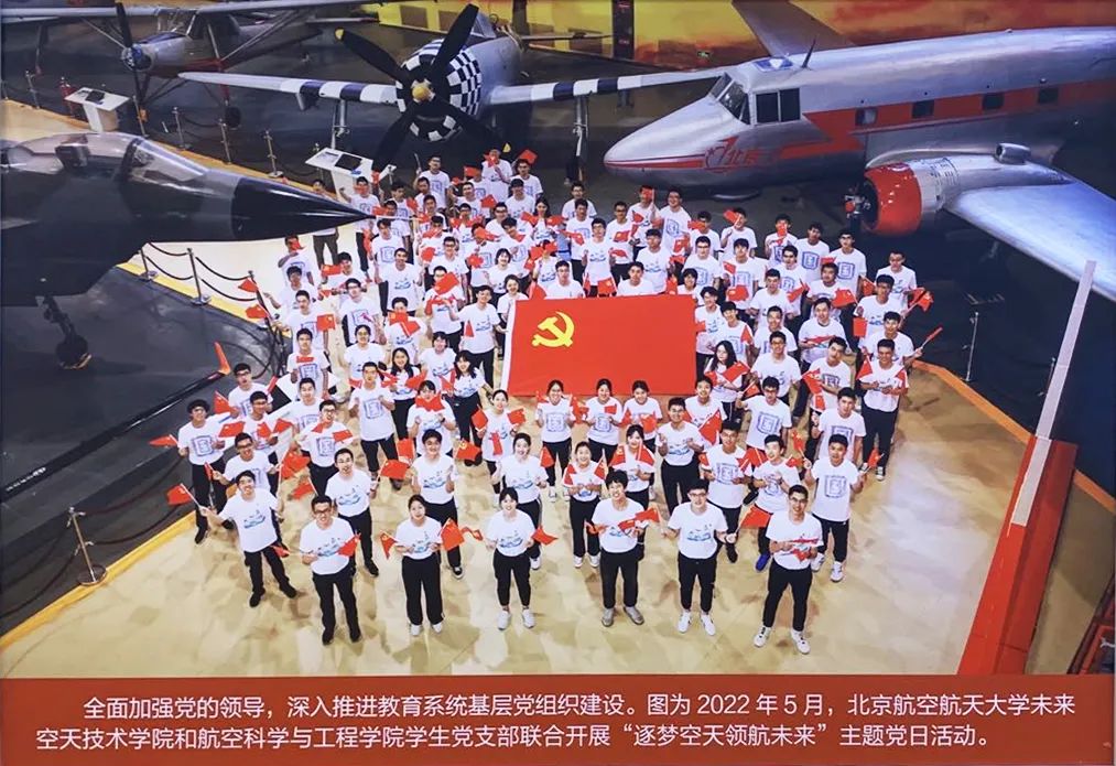 “优先发展教育事业”板块展示了我国在新时代这10年,坚持把教育作为国之大计、党之大计,贯彻党的教育方针,落实立德树人根本任务,构建德智体美劳全面培养的教育体系,推进教育强国建设,培养担当民族复兴大任的时代新人,教育总体发展水平跃居世界中上行列,教育现代化取得重大进展的系列成就。展示墙上,师生们看到了北航未来空天技术学院和航空科学与工程学院学生党支部联合开展“逐梦空天 领航未来”主题党日活动的生动场景。
