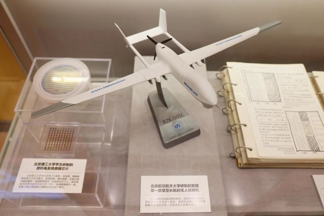 不远处的展示柜里,展出了北航研制的我国第一款某型长航时无人侦察机“BZK-005C”模型。北航始终服务国家重大战略需求,作为我国无人机技术的开拓者、奠基者,创造了中国无人机历史上若干个“第一”。展览展示的无人侦察机具备侦察距离远、续航时间长等特点,两次获得国家科技进步一等奖??醋耪构裰械奈奕嘶P?,能源与动力工程学院2019级本科生樊嘉森非常自豪:“展览中的无人机模型令我热血沸腾,让我看到了祖国国防力量与科技实力的强盛,这其中也有诸多北航人的贡献。作为北航学子,我必当矢志空天报国,为祖国航空航天事业而奋斗,为实现中华民族伟大复兴贡献出自己的力量?!?/p>