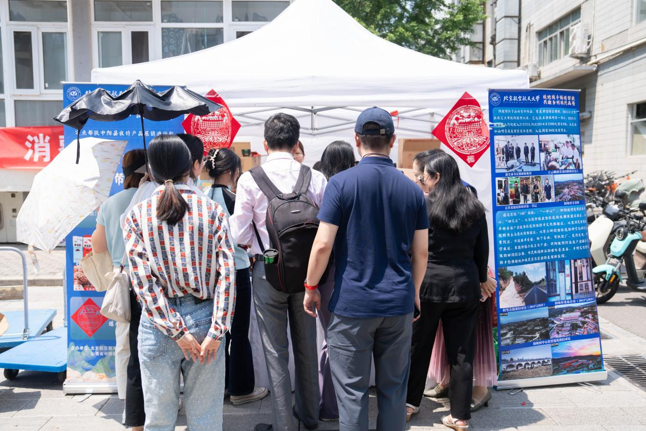 在学校相关部门的积极推动下,本次展销活动得到师生广泛关注。活动精选中阳县数十种绿色健康农产品,包括粽子、木耳、核桃、小米、枣夹核桃、老陈醋等, 突显中阳农产品的特色和品质。活动还特别融入国家级非物质文化遗产“中阳剪纸”元素,每位购买农特产品的消费者即可获赠中阳剪纸作品《北航主楼》,非遗文化与消费帮扶深度融合,极大提升了活动吸引力。现场还通过展板等形式,全面展示中阳农特产品与文旅资源,让师生更直观了解帮扶成果,激发消费意愿。活动现场气氛热烈,吸引了大量师生和公众参与。