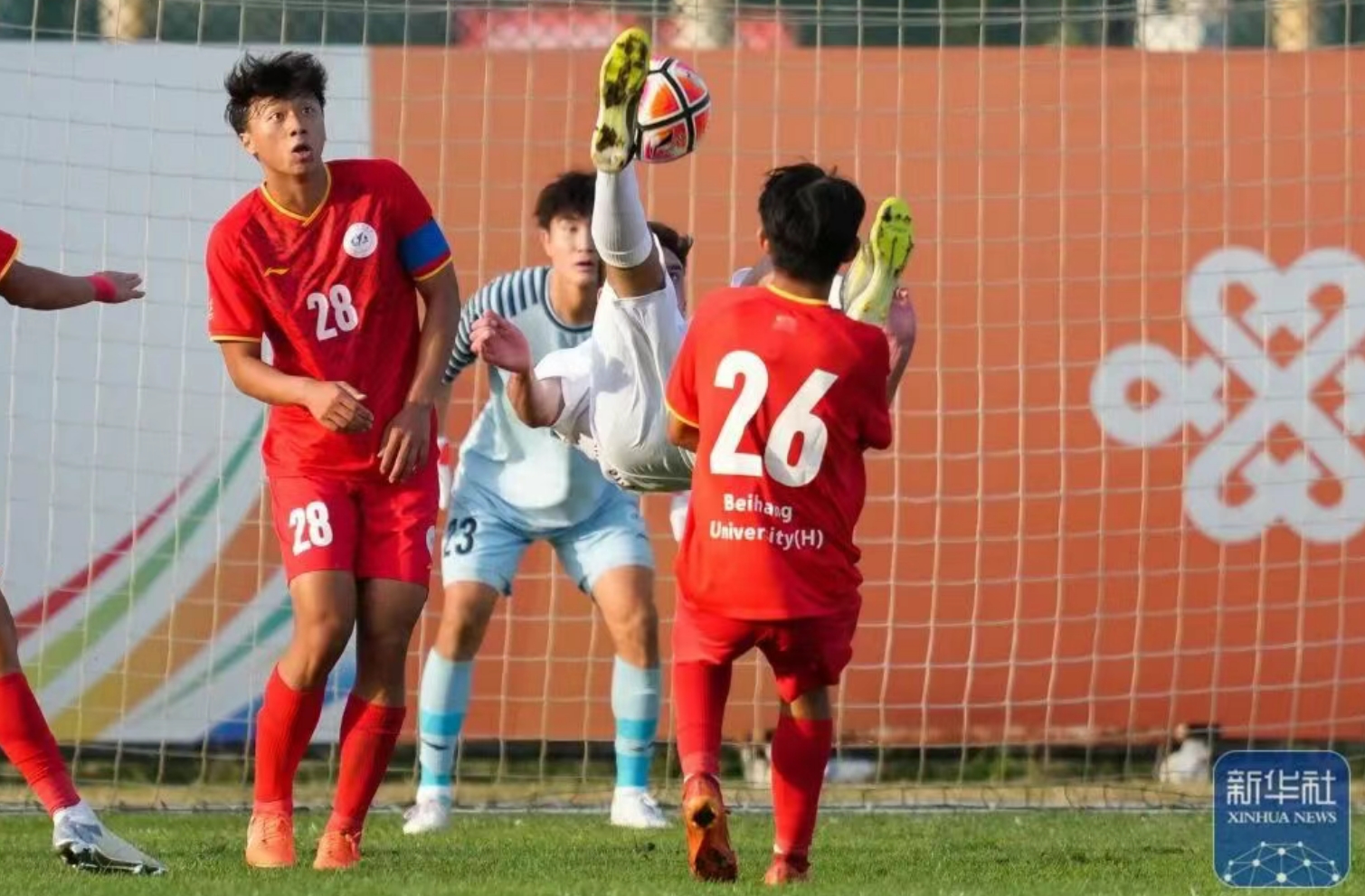 北京航空航天大学男足球员程曦阳(右)在比赛中打进点球。
