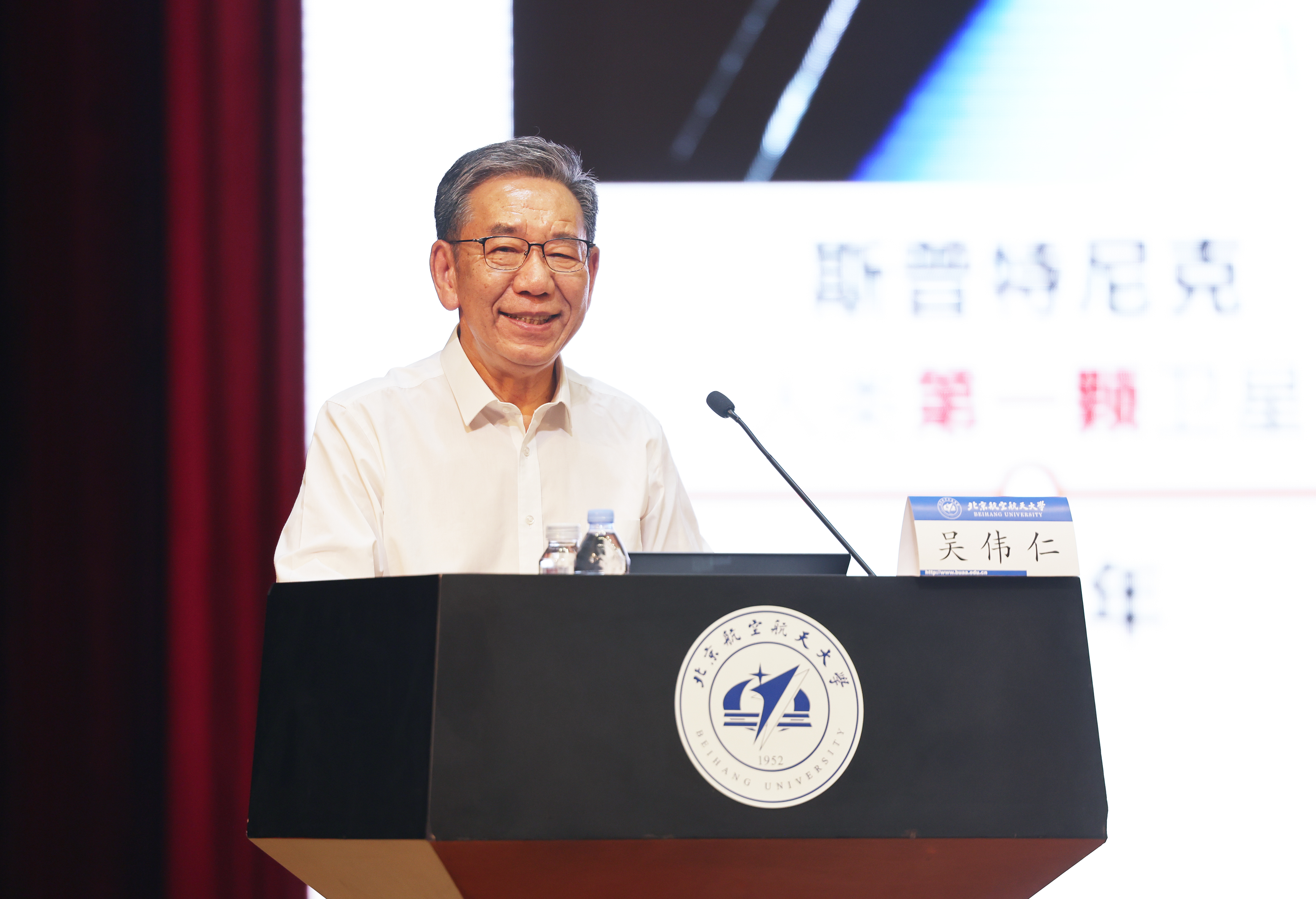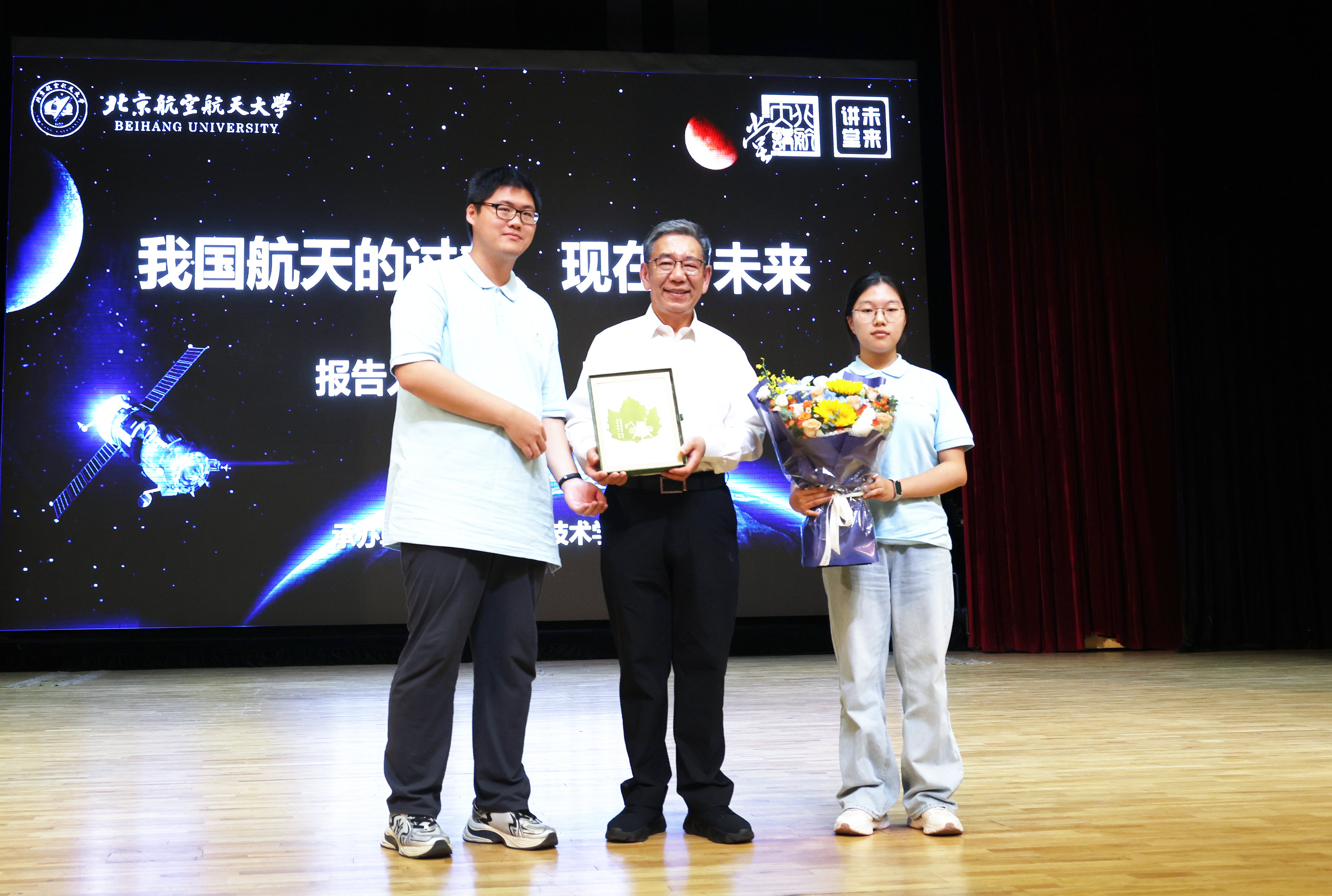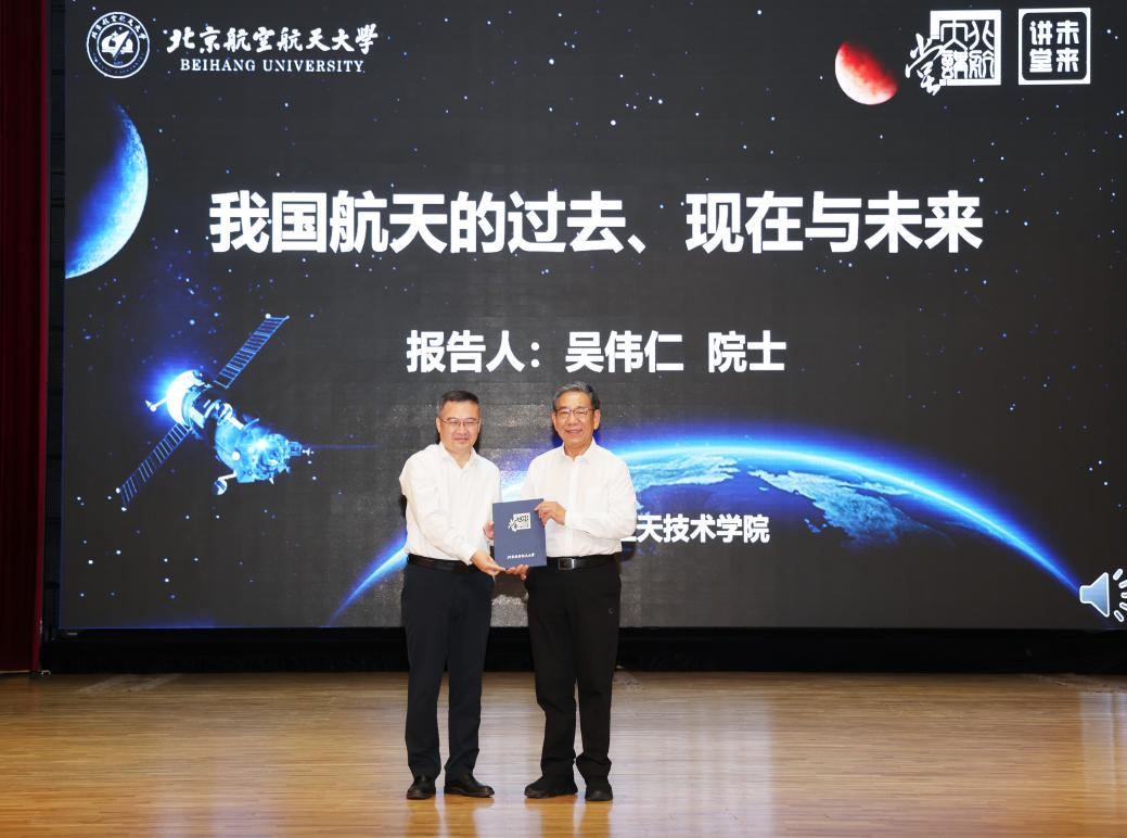 北航新闻网10月3日电(通讯员 宫凡 时常乐)9月28日上午,中国探月工程总设计师、中国工程院院士、未来空天技术学院创始院长吴伟仁来到晨兴音乐厅做客北航大讲堂暨《未来空天技术导论》,为600余名北航师生带来一场题为《我国航天的过去、现在与未来》的专题报告。北航党委副书记、纪委书记刘洪仓为吴伟仁院士颁发北航大讲堂荣誉证书,副校长邓怡出席报告会。