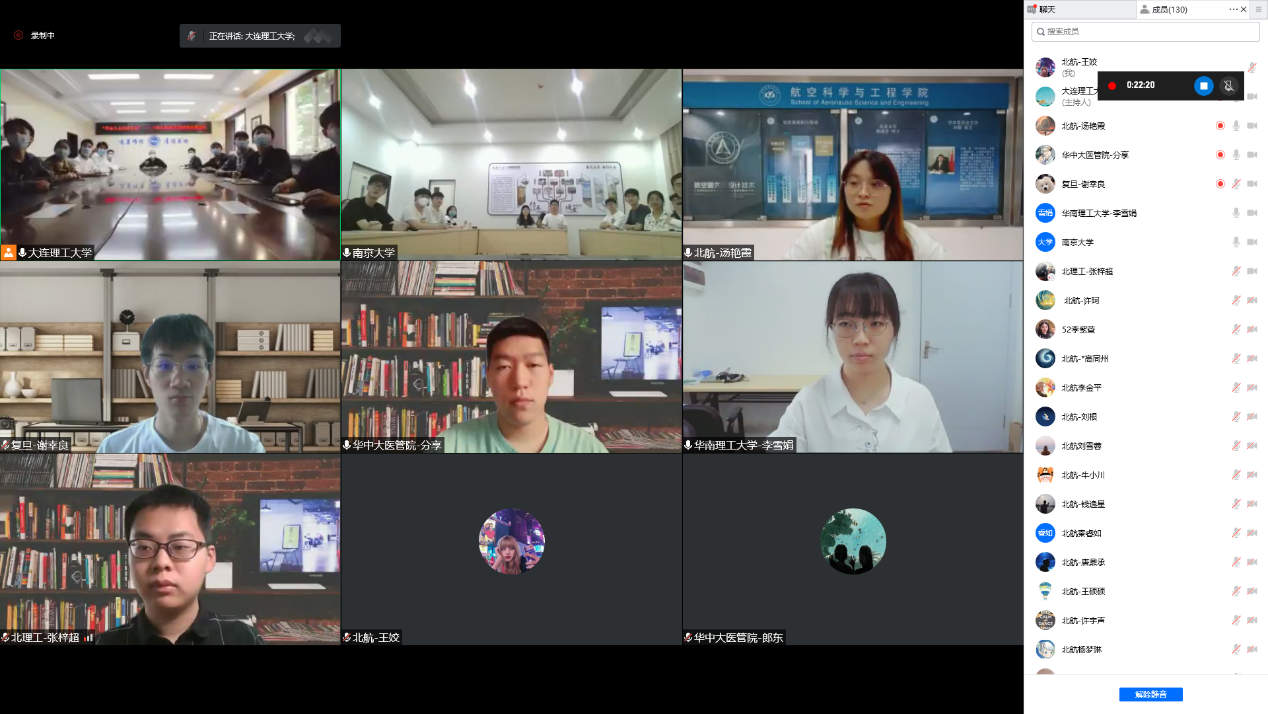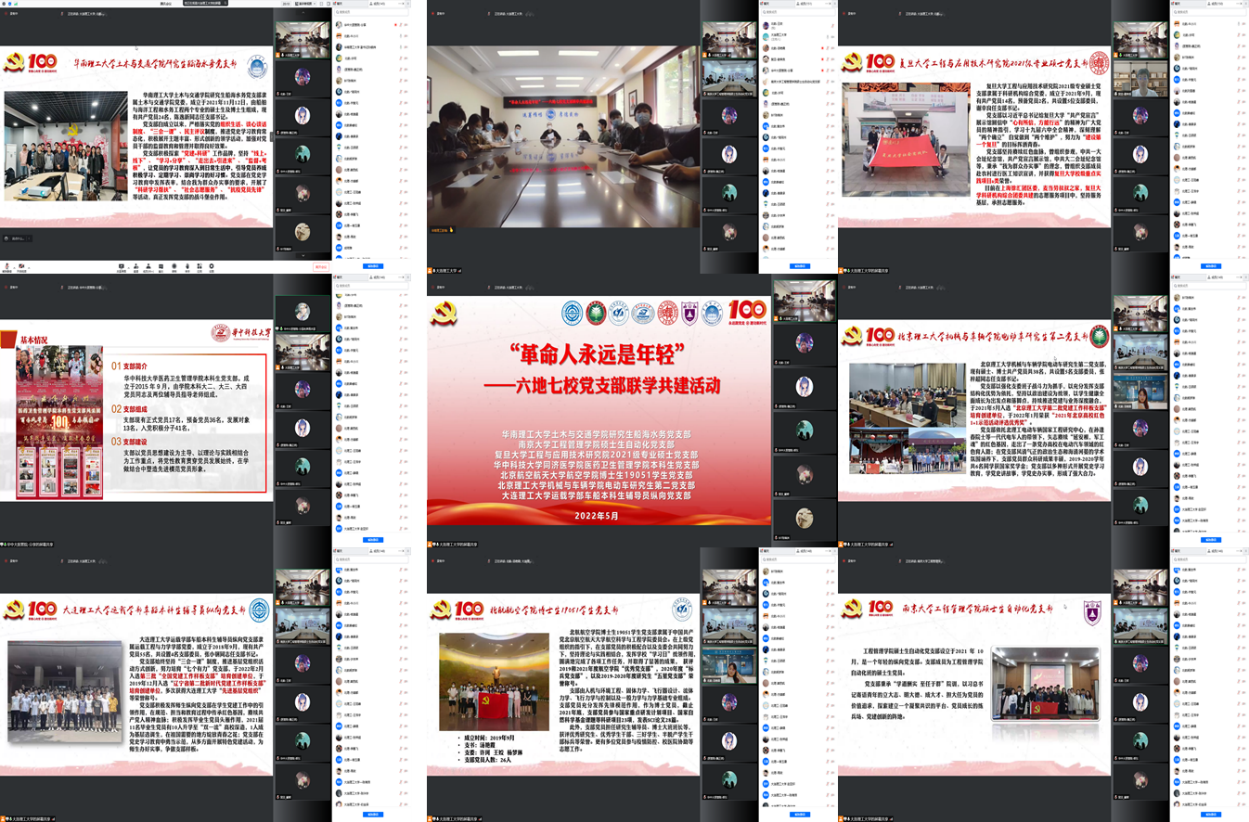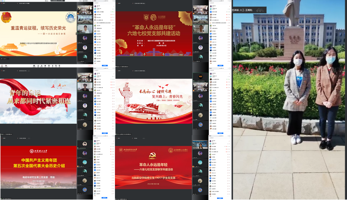 北航新闻网5月29日电(通讯员 王姣)为了深入学习习近平总书记重要讲话精神、回顾共青团百年发展历史,北航航空学院博士生19051学生党支部于5月25日携手华南理工大学、南京大学、复旦大学、华中科技大学、大连理工大学、北京理工大学等6所“双一流”高校师生党支部开展主题为“革命人永远是年轻”党支部联学共建活动。