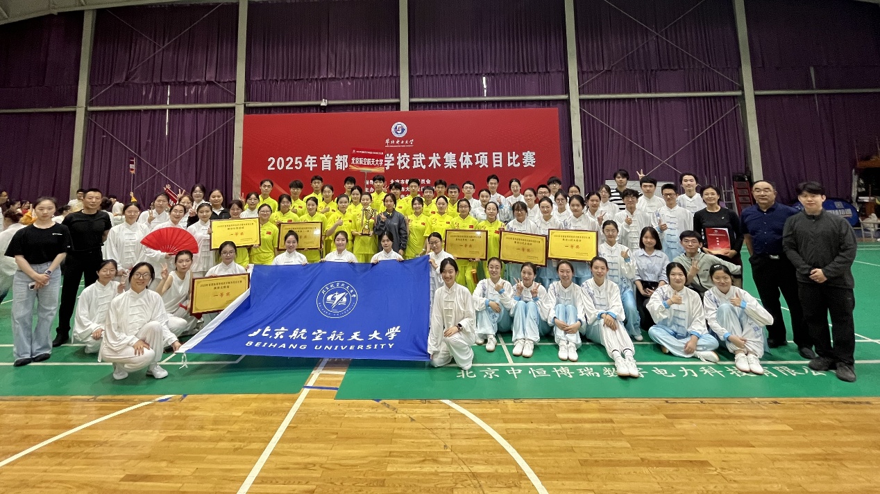 北航新闻网6月13日电(通讯员 肖雯文)日前,由北京市大学生体育协会主办,华北电力大学承办的2025年首都高等学校武术集体项目比赛在华北电力大学体育馆举行。体育部薛泰来、周宇娇、沈霞三位老师老师带领武术队71名队员参加5个项目的比拼,全部获得一等奖,最终夺得团体总分第一名。周宇娇老师获得“优秀教练员”称号,张业寻同学获得“优秀运动员”称号。