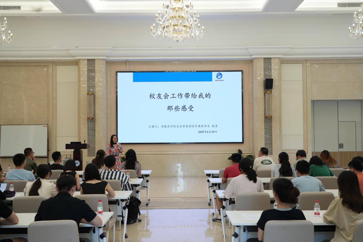 随后,86级能源与动力学院校友代表、北航校友会副秘书长赵清结合十多年校友会工作经验,向学弟学妹们分享感悟:一是校友们积极投身校友工作,无私奉献,尽显大爱无疆的人性光辉;二是作为校友联络人,这份工作兼具智慧与善意;三是从事校友工作能够锻炼个人修为,成就更好的自己;四是校友工作意义非凡,校友们在其中互相成就、温暖彼此,传递北航情怀。她期待各位校友班级联络员不辜负信任,勇于担当,成就新的自我。