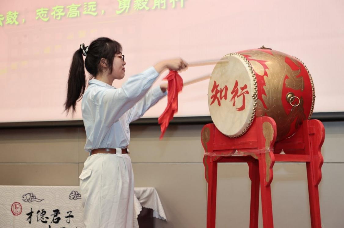 鼓声振振,齐鸣志向。“击鼓明志”环节,知行书院2024级老生代表李开为同学击鼓三次,人文与社会科学高等研究院分团委书记张晓明介绍击鼓明志的意义,铿锵鼓声象征着同学们勤学苦读、志存高远、勇毅前行的坚定决心。