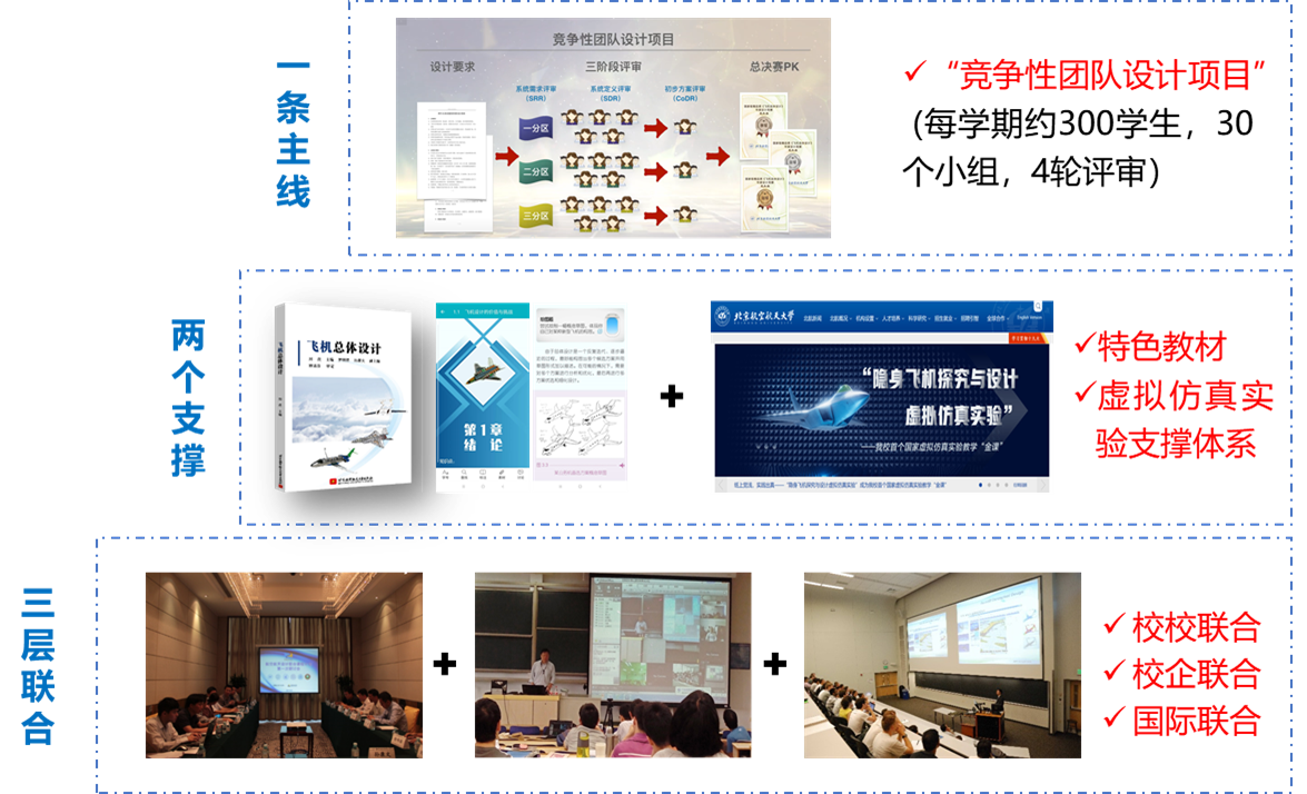 课程组高度重视教学与实践相结合,国内与国际相结合,密切各方之间的深入合作与优势互补。从2009年起“大师进校园”中顾诵芬院士、李天院士、孙聪院士等为学生授课指导,到2011-2013年的“北航-美国普渡大学飞机设计联合课程计划”,到2014年发起“航空航天设计联合课程计划(PADUC)”,再到2016年联编教材,联合育人已形成长效机制。