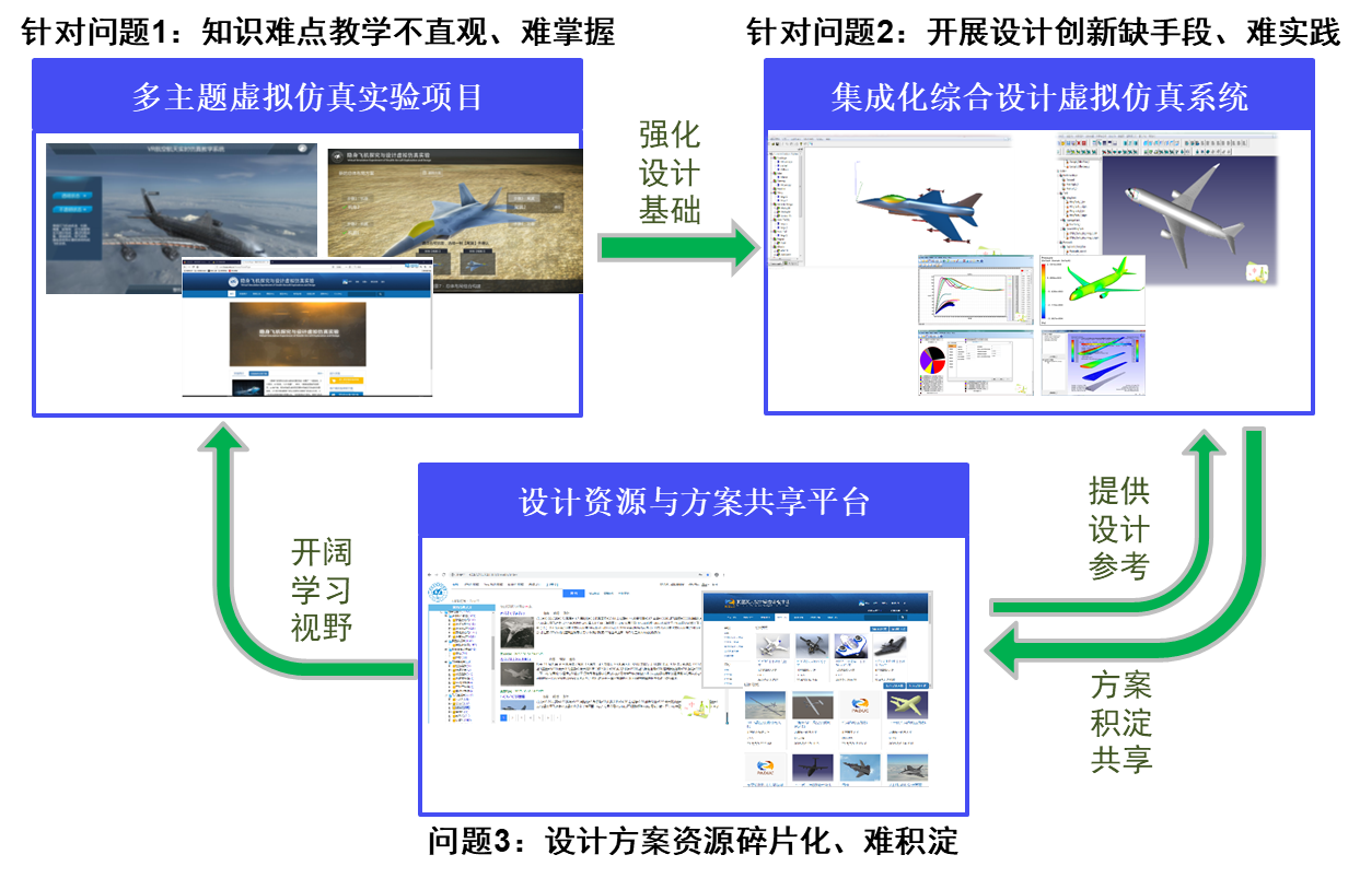针对教学过程中,知识难点教学不直观、难掌握,开展设计创新缺手段、难实践等问题,结合课程团队所依托的“航空器先进设计技术”工业和信息化部重点实验室、“虚拟现实技术与系统”国家级重点实验室的优势科研成果,逐步建立了包括多主题虚拟仿真实验项目、集成化综合设计虚拟仿真系统、设计资源与方案共享平台这三个有机联系方面的虚拟仿真体系,对飞行器设计专业学生从通识到专业的学习和实践提供支持,相关成果也荣获2019年校级教学成果一等奖。