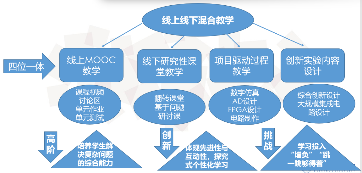 (1)提出了成果导向的研究性“四位一体”融合教学模式。坚持构建主义学习理论为指导,将长期教改研究成果固化为“四位一体”融合教学模式:学生问题导向线上MOOC学习,自主构建逻辑电路知识平台;翻转到课堂针对集成逻辑电路的设计和应用等重点难点,基于案例深入消化理解;线下组队项目研究,以航空航天工程逻辑问题牵引,提出创新设计方案;延伸设置创新综合实验,将组队研究的项目进行实验电路验证。