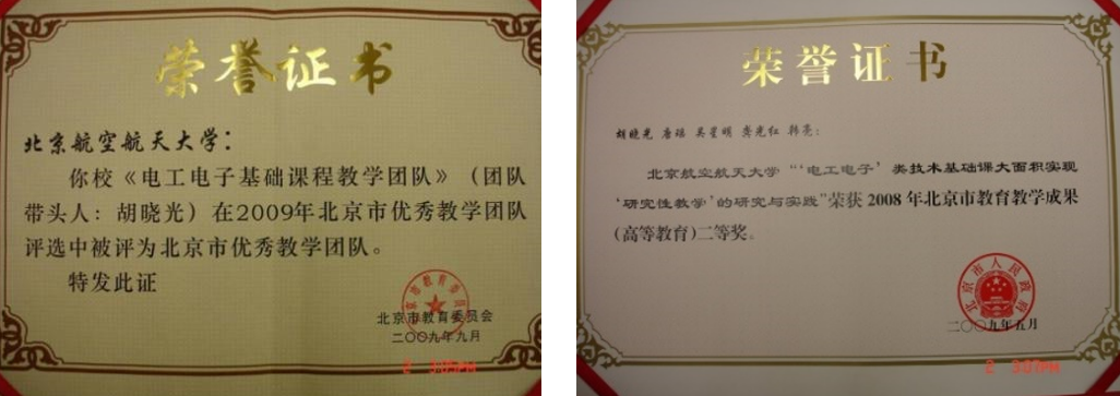 《数字电子技术基础》是北航自动化等专业的工程基础核心课程。在胡晓光教授的带领下,课程团队自2005年以来,深入研究国内外前沿教学理念和发展趋势,不断开拓创新,于2005年提出采用基于构建主义学习理论的研究性教学模式,课堂教学基于问题展开,组织开展项目研究,提高了学生自主学习和解决实际工程逻辑问题的能力。该教学模式的研究与实践取的显著效果, 2007年被评为北京市精品课。为了提高研究性教学的效果,团队继续深化试点开展小班化研究性教学。2008年电工电子类技术基础课大面积实现‘研究性教学’的研究与实践,获北京市教学成果二等奖。2009年教学团队评为北京市优秀教学团队。