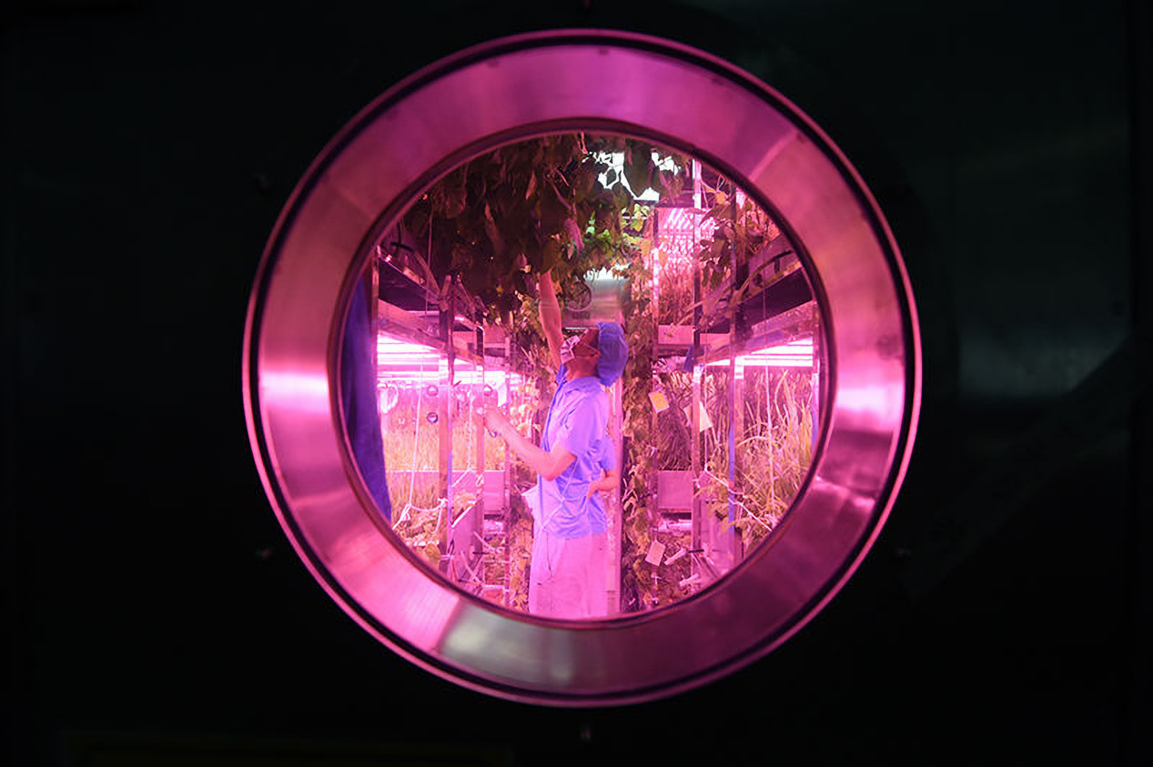 为了解决吃的问题,实验人员在“月宫”植物舱里种植粮食、蔬菜和水果。太空舱里呈现的红蓝色光源是为光合作用特别设定的光谱频段,因为植物对红蓝光的需求最为旺盛,在这样的光照条件下,作物能更加健康迅速地生长。