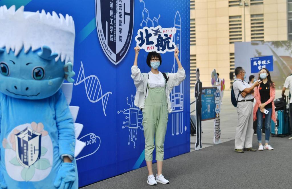 9月14日,北京航空航天大学2020级本科报道,校门口学生通过测温门,体温正常方可入校。