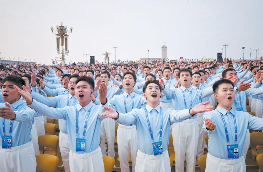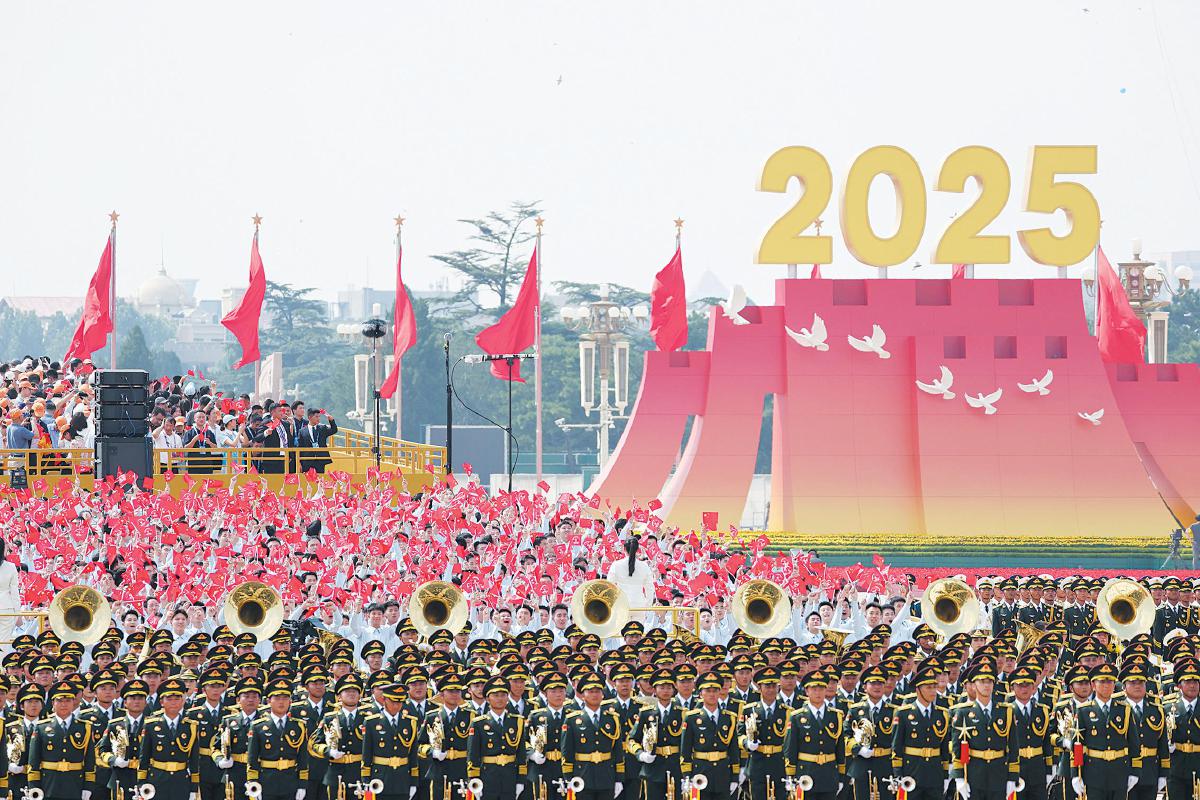 9月3日,纪念中国人民抗日战争暨世界反法西斯战争胜利80周年大会在北京隆重举行。图为中国人民解放军联合军乐团和合唱团。新华社记者 杨磊 摄