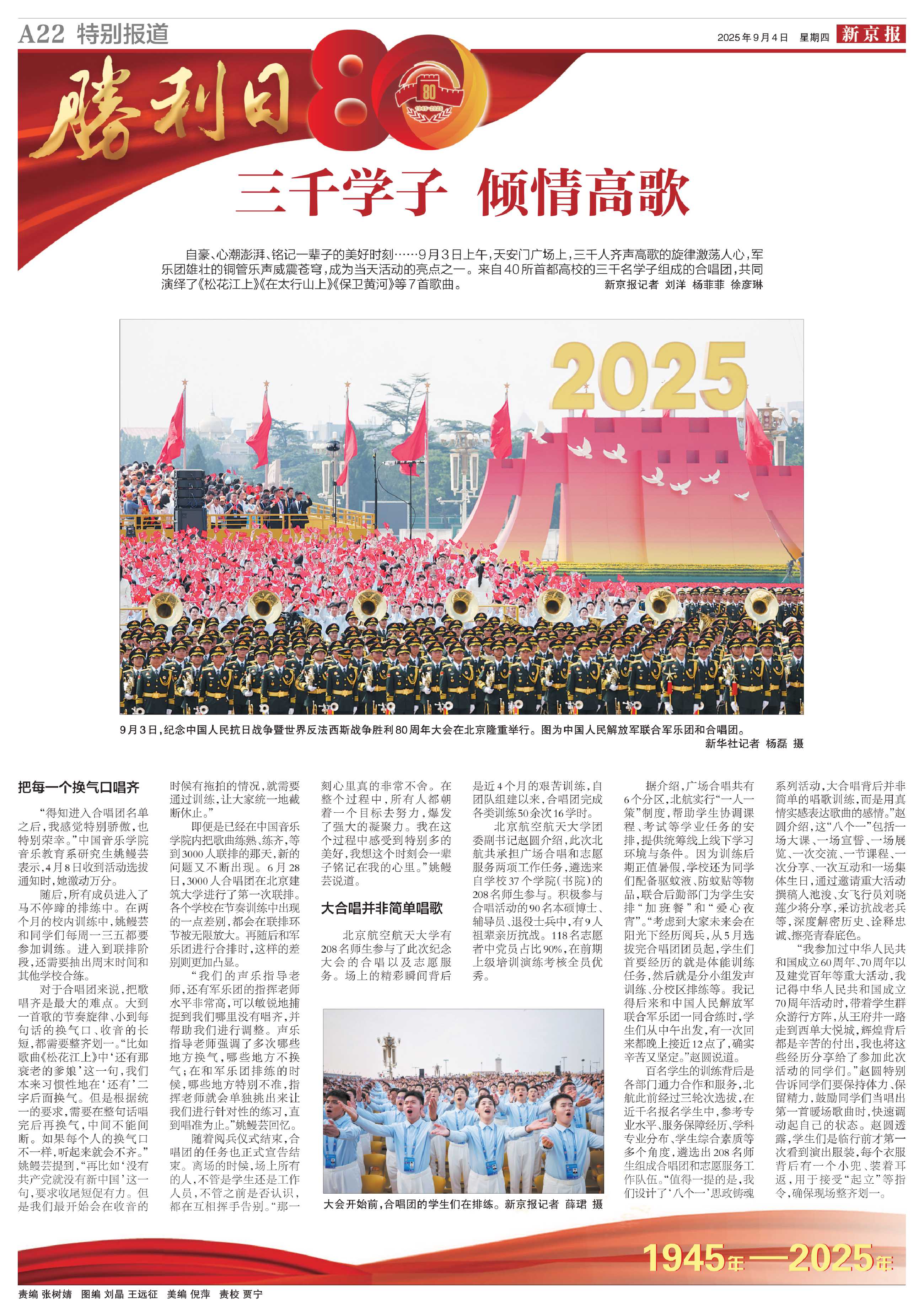 百名学生的训练背后是各部门通力合作和服务,北航此前经过三轮次选拔,在近千名报名学生中,参考专业水平、服务保障经历、学科专业分布、学生综合素质等多个角度,遴选出208名师生组成合唱团和志愿服务工作队伍?!爸档靡惶岬氖牵颐巧杓屏恕烁鲆弧颊晗盗谢疃?,大合唱背后并非简单的唱歌训练,而是用真情实感表达歌曲的感情?!闭栽步樯?,这“八个一”包括一场大课、一场宣誓、一场展览、一次交流、一节课程、一次分享、一次互动和一场集体生日,通过邀请重大活动撰稿人池浚、女飞行员刘晓莲少将分享,采访抗战老兵等,深度解密历史、诠释忠诚、擦亮青春底色。