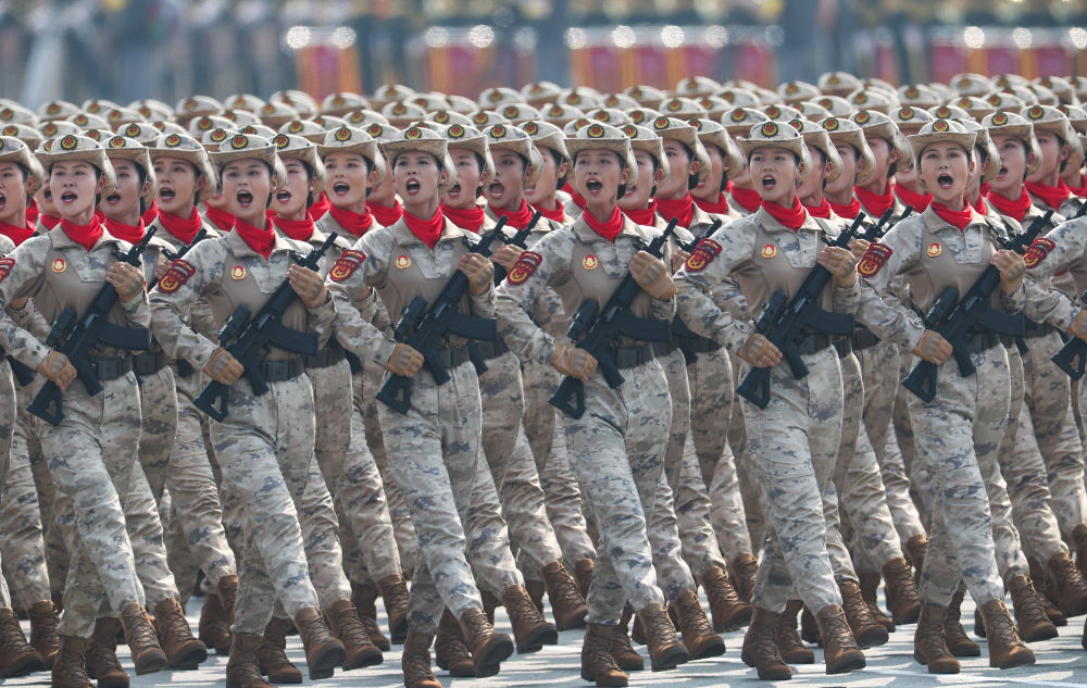 民兵方队英姿飒爽,受阅女民兵来自当年全国主要抗日根据地。