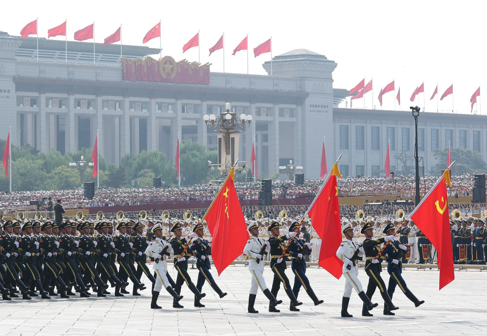 2025年9月3日,纪念中国人民抗日战争暨世界反法西斯战争胜利80周年大会在北京隆重举行。这是战旗方队接受检阅。新华社记者 王建华 摄