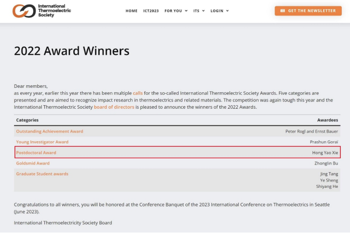 国际热电协会优秀博士后研究员奖