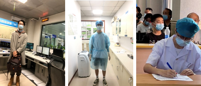 左一:曾子函担任地铁站志愿者,右一、二:曾子函担任防疫志愿者