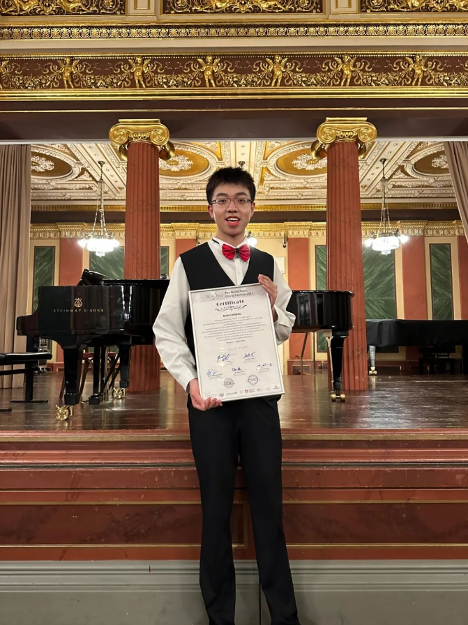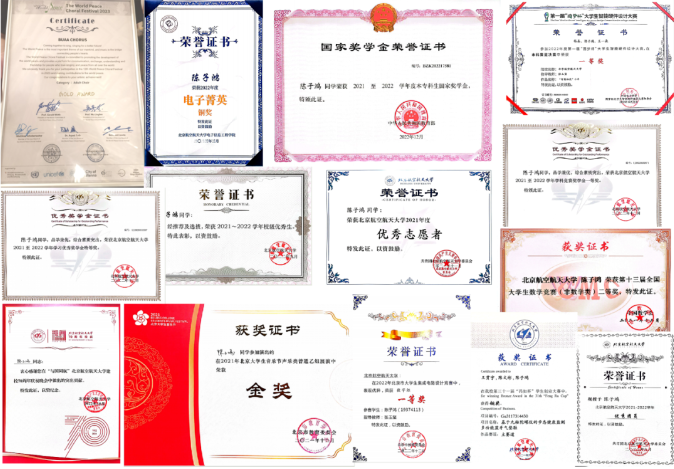 2023年暑假,维也纳金色大厅迎来了第十二届世界和平合唱节,陈子鸿随团前往。由杨乐乐老师指挥的北航学生合唱团斩获比赛金奖,被问及获奖感言时,陈子鸿说:“合唱团里没有我,只有我们,少了谁也不行。为形成完美和声,需要信任你身边的每一个人。在维也纳与大家的合唱声共鸣,感到仿佛在与时代同频共振,与北航携手同行。”