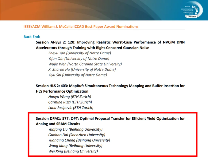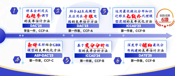 针对良率优化难题,刘艳芳打破传统,进行不同设计参数之间的知识迁移并共享仿真资源,最终相比其他良率优化方法,将计算效率提升千倍,优化良率高达99.99999%,荣获2023年EDA顶级会议ICCAD最佳论文提名奖。
