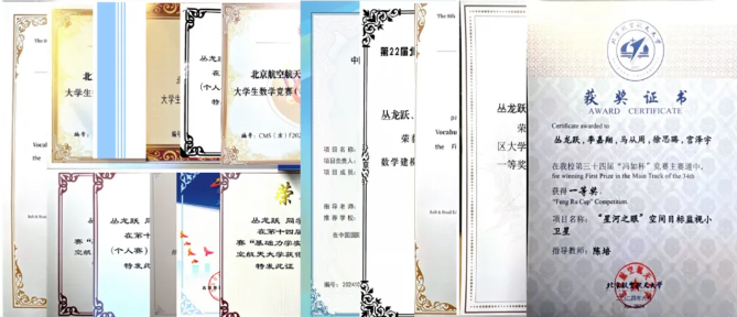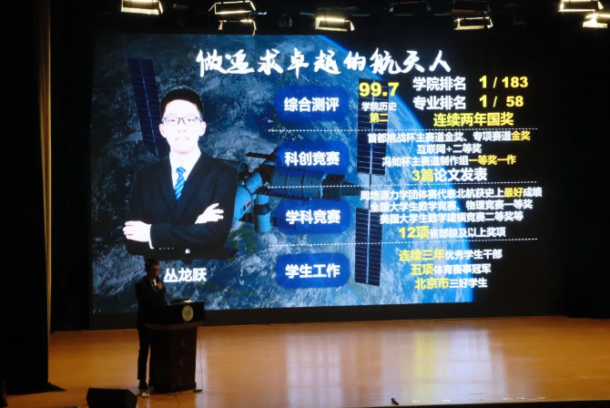 他是北航学生最高荣誉“沈元奖章”获得者,GPA专业排名第一,综合测评成绩99.7分,排名年级第一、学院历史第二;他助力完善太空卫星体系,成功发表了3篇论文,以赛道第一名的成绩斩获首都挑战杯专项赛金奖,共获12项省部级及以上奖项;他是北京市三好学生,连续三年获得校、院优秀学生干部,于五项体育赛事中斩获冠军;他决定来北航,做一位追星星的人,“追星”的他亦成为同学们的启明星。他就是宇航学院2021级本科生丛龙跃。