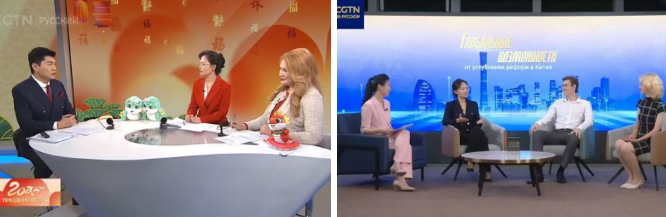 左图:2025年,总台央视春晚直播特别节目在CGTN俄语频道播出,王悦作为特邀嘉宾参与直播 右图:2024年,王悦受邀参加总台央视英语环球节目中心《青年圆桌派》节目